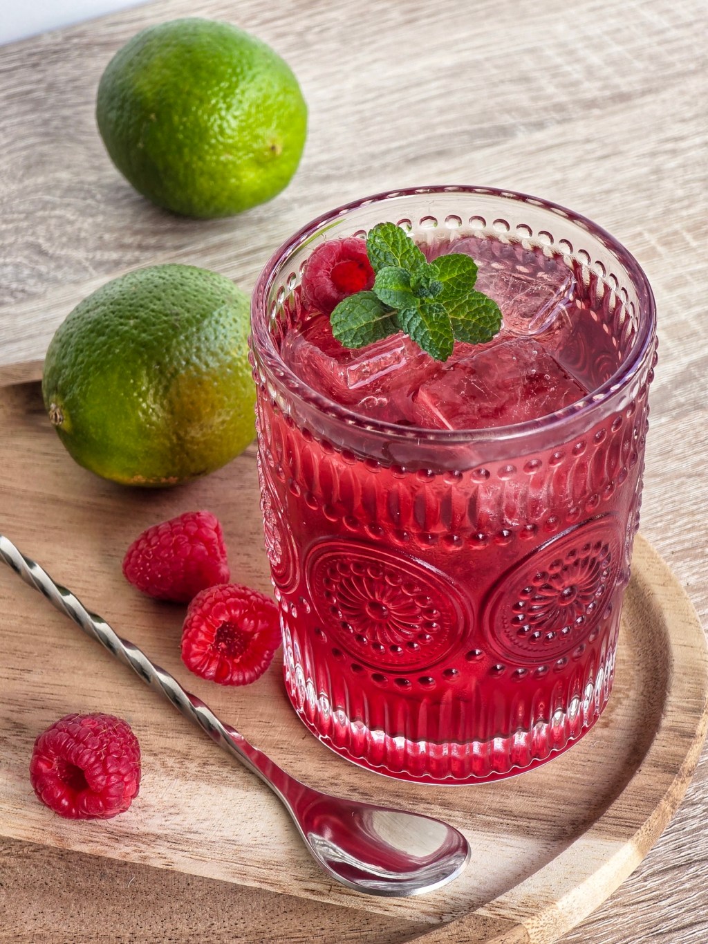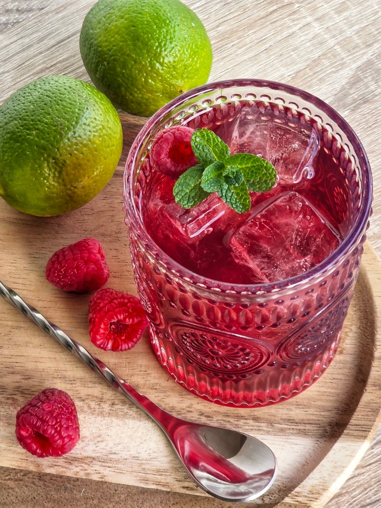 - Filtrar con double strainer su ghiaccio e guarnire con lamponi freschi e qualche fogliolina di menta, se gradita.